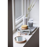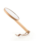 מראת מייקאפ עם ידית אחיזה מעץ בוק מסדרת מוצרי הספא שלנו.